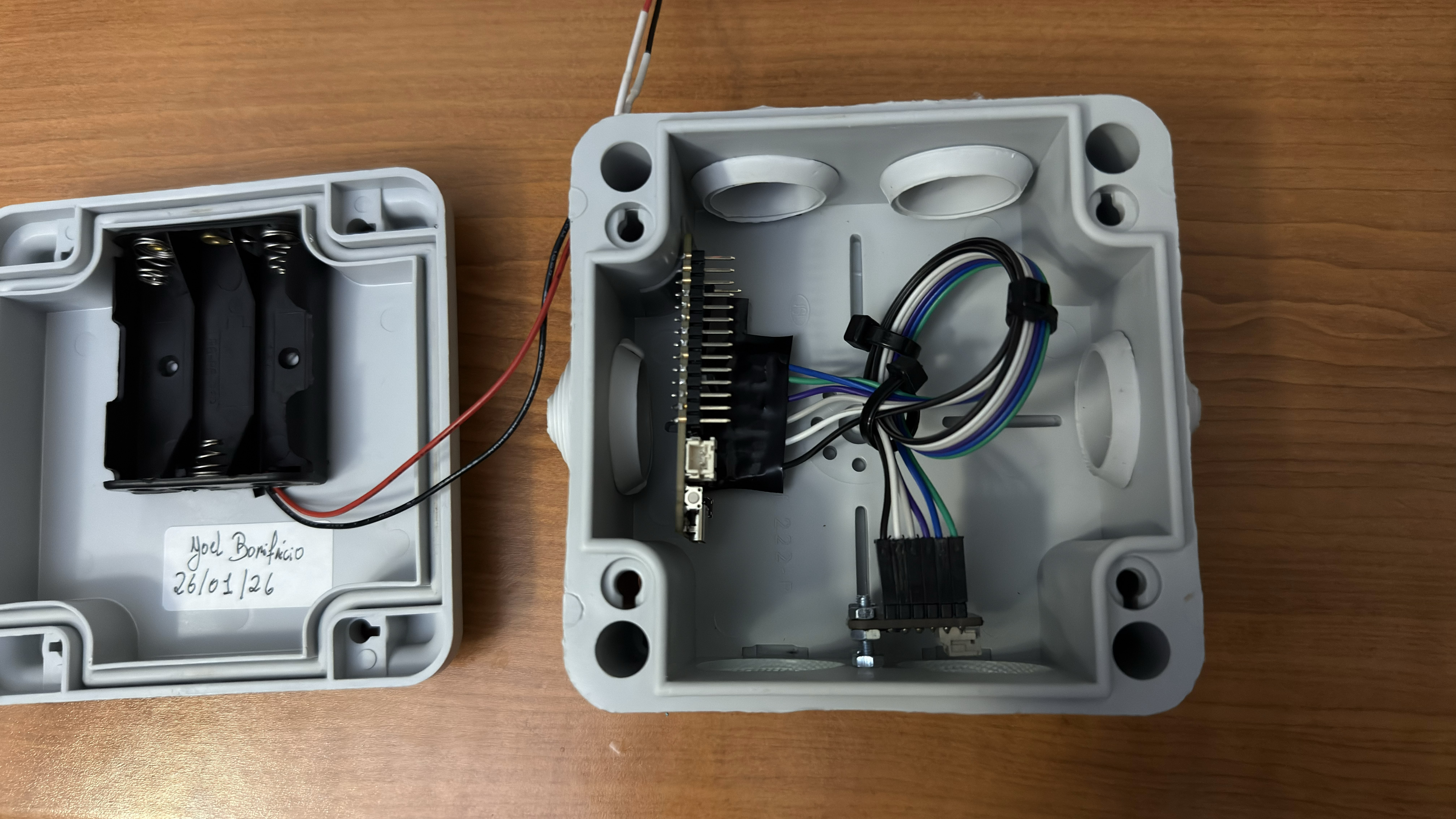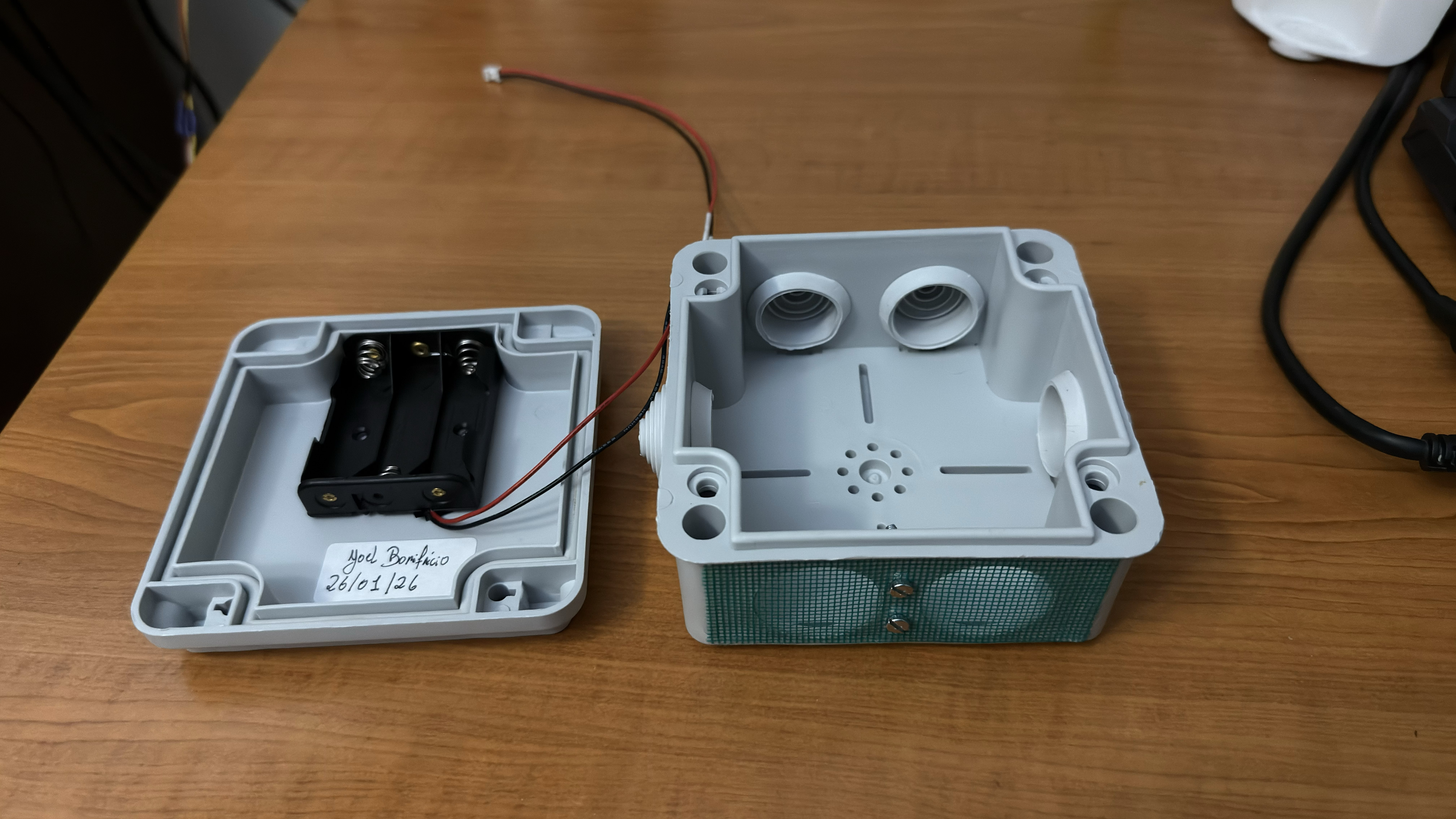 I bought a waterproof box and made some minor modifications to adapt it to this project. It has two large holes in the bottom for ventilation, and right above them is the BME280 sensor. The goal is to prevent water from entering, especially since it's windy and raining heavily here (which is quite common), but at the same time, to avoid interfering with the sensor readings. I also put a very fine green mesh to prevent insects from getting in and covering the sensor hole. Now it will be screwed to the outside wall of the house.