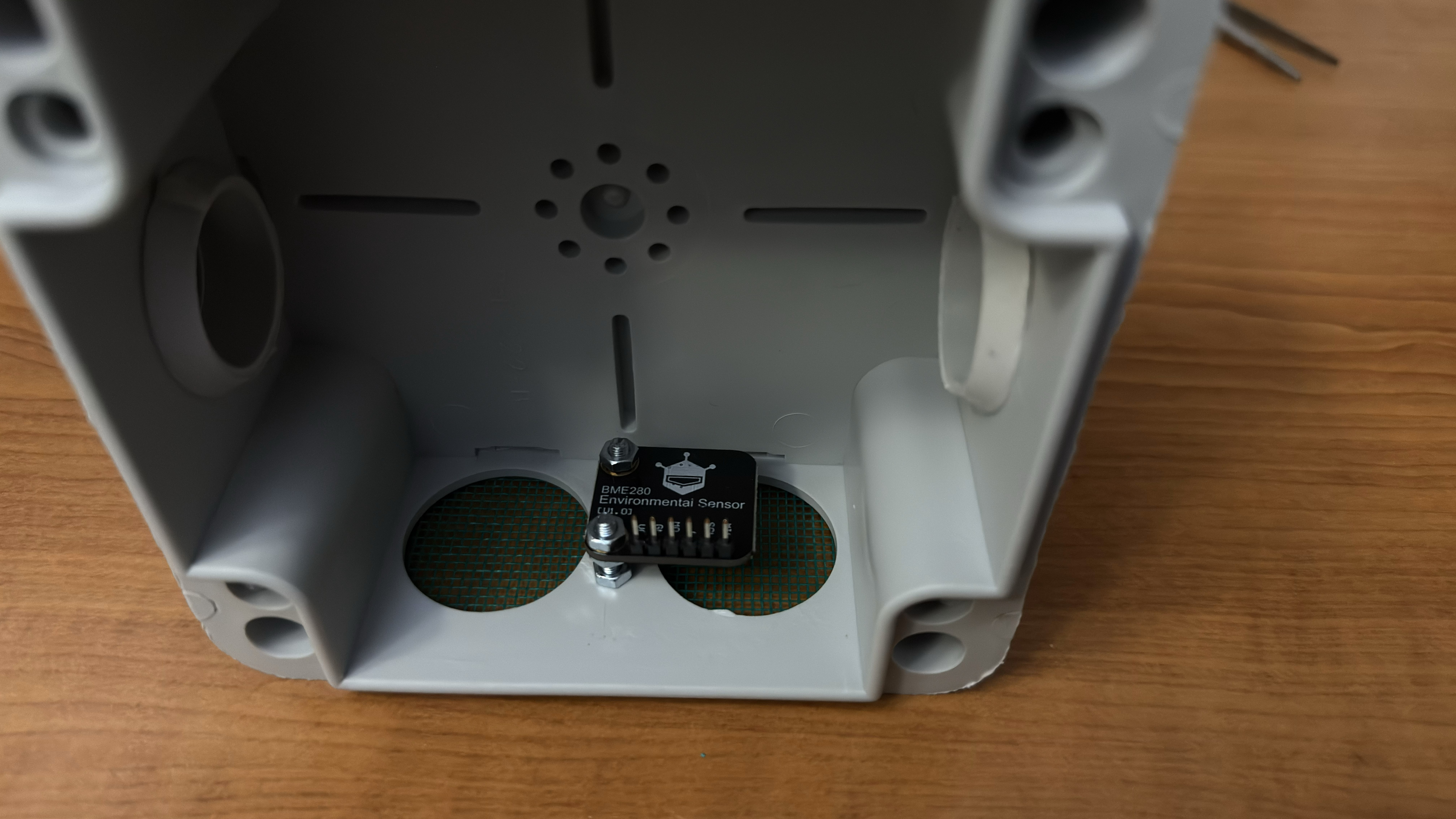 It has two large holes in the bottom for ventilation, and right above them is the BME280 sensor.
