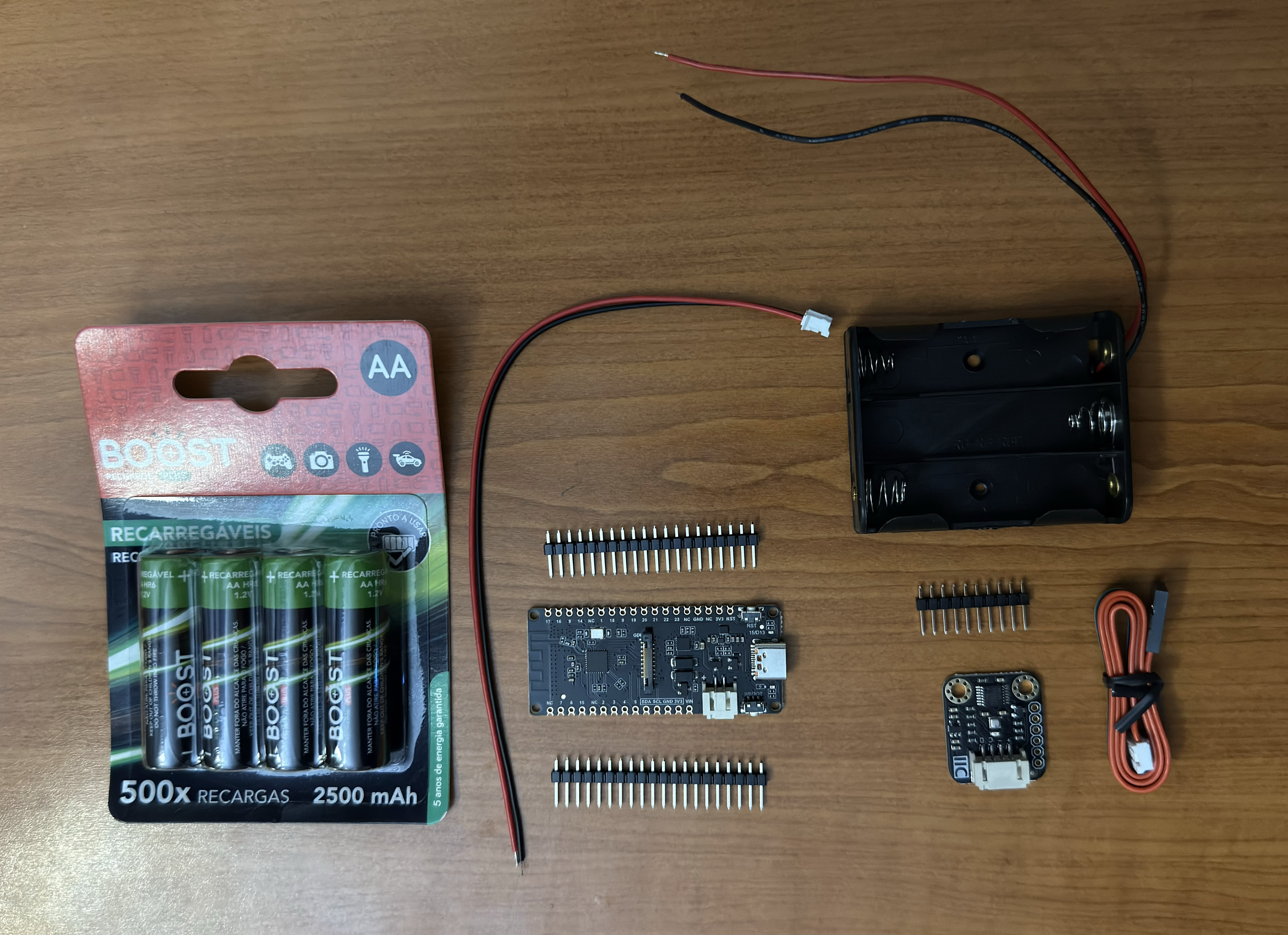 Fig.1 - Materials: ESP32, BME280, batteries, support for the batteries and cables.